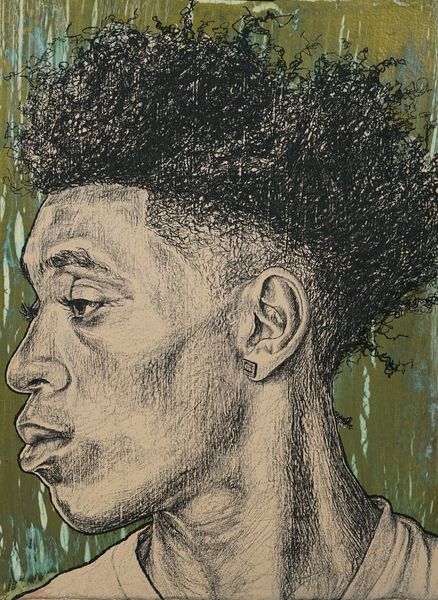 Curator: Welcome. We’re looking at Alfred Conteh’s mixed-media piece entitled “Quan’ta.” Editor: It strikes me immediately—there’s a compelling visual language at play. A striking yet serene portrait. The silver lines dissecting the figure almost give a topographic quality to the human form. Curator: Precisely. Notice the layering. The figure is built up through meticulous application, almost pointillist in its execution. See how the cracks in the gold backdrop play against the smooth, confident contour of his face. Editor: The silver vein-like markings bring a host of symbolic connotations to mind. Think about veins in marble sculptures of Greek gods, connecting it to classic representations of power, but also, these are the lines in tree bark—it ties the sitter back to the earth and ancestral history, and a personal evolution as seen through tattoos and contemporary hairstyling. Curator: The interplay between these lines and the skin tones is where the painting finds its formal tension, right? Conteh expertly handles tonal values—light dances across the surface, while texture is cleverly evoked with sparse mark-making. Editor: Right—like how you read his expression not from clear marks, but how the cracks align just right to define a sort of subtle stoicism in his downturned mouth. You're experiencing something complex from minimal cues. And those silvery tributaries--they evoke ideas of ancestry, community, maybe the journey of identity. There's so much happening at once, both structurally and representationally. It makes you wonder about the story underneath the surface. Curator: Indeed. It offers us much to ponder about representation, about self-presentation, about form and expression—how Conteh’s innovative method allows for an authentic mode of portraiture. Editor: This portrait has resonated with me—not merely a rendering of a person, but almost like a psychological landscape charted across the skin. Thank you for that astute observation. Curator: The pleasure was mine. A rewarding dissection.