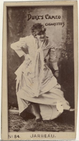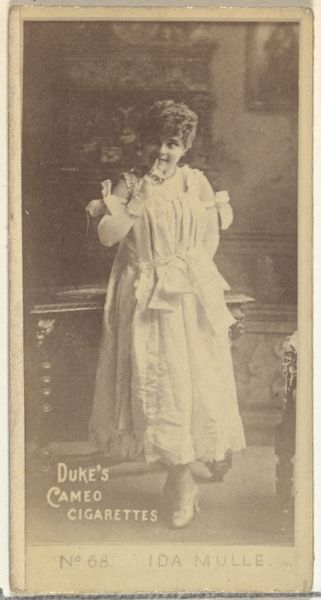 This is "Card Number 52, Geraldine Ulmer," a promotional card from the Actors and Actresses series, created around the turn of the century by W. Duke, Sons & Co. to advertise Cross Cut Cigarettes. The sepia tone flattens the image, emphasizing its graphic nature. The composition is carefully structured to merge advertising with the allure of the stage. Ulmer, posed in what appears to be a kimono, sits before a screen displaying the brand name. The curves of her figure contrast with the rectangles of the folding screen, and the floral motifs of the screen echo those on her robe. This interplay of figure and ground underscores the card's function as a sign. Ulmer becomes a cultural signifier, associated with both exoticism and the burgeoning celebrity culture of the time. The card is a fascinating example of how commercial imagery uses cultural codes to create desire, blurring the lines between art, commerce, and identity.