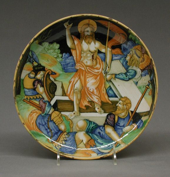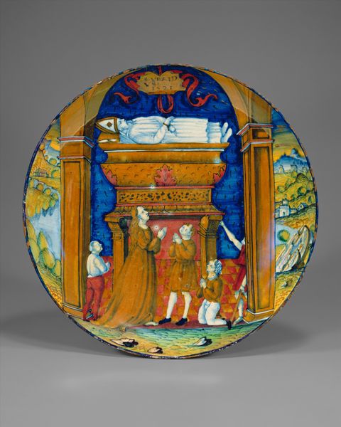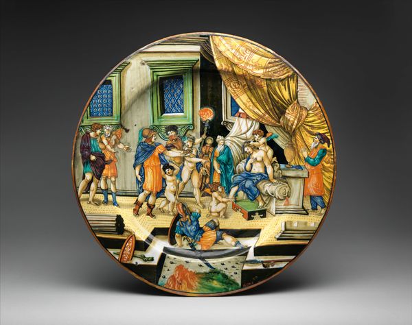 Curator: Okay, let's dive into this vibrant ceramic relief, "The Anointing of David by Samuel," crafted sometime between 1520 and 1545. It’s got that undeniable Italian Renaissance flair, but something about its composition really zings for me. Editor: It's on a plate! That was my first thought, like a beautifully painted, kinda funky, serving dish. And it looks almost too detailed to actually serve food on it. How do you read the space of the composition? Curator: Right? Who would put a salad on this? The spatial arrangement, though, is quite theatrical. Look how the figures are almost bursting from the round, with this raised, almost dreamlike rendering. It's compressed but manages to feel vast. Are we in a courtyard, a palace, or even a stage? Does the backdrop feel biblical to you? Editor: Not particularly, to be honest. It looks more like an opera set. What about that golden light and those figures on the sides? Are there classical elements? Curator: I'm so glad you picked up on that! Notice how the golden hues evoke classical ideals, even while the slightly cartoonish expressiveness of the figures lends it a unique, somewhat mischievous energy. But where are our typical renaissance colour scales, in all that earthy saturation and almost graphic light play? And the subject matter adds so much. The anointing, the selection. But what did this say to people at the time it was made? Editor: That tension is really interesting, this classical scene presented in such an expressive manner. I am also left to wonder why its shaped the way it is, rather than something of its more familiar format. Curator: Exactly, we can almost taste a Renaissance desire for ideal form struggling against a love for human storytelling. A divine script captured within an ordinary, everyday object – what could be better than that? It whispers of ancient stories and maybe some contemporary ones too! Editor: That's a great point, it's a lovely plate of human and art history!