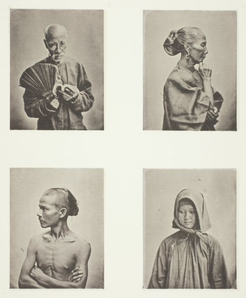 Curator: John Thomson, around 1868, created these four photographic studies, now held at The Art Institute of Chicago. The work is titled "Boat Girls; A Canton Boatwoman and Child; Musicians; Musicians". Editor: I'm immediately drawn to the stillness and quiet intimacy. Despite being a collection of separate images, there's a unified tone. The monochromatic palette adds to this, focusing my attention on textures and the way light interacts with their garments and faces. Curator: Absolutely. Thomson was keen to document the diverse social fabric of China, moving beyond simply aesthetic images to show the daily lives and professions. The 'boat girls,' for example, highlights the significant role women held in river transport and commerce. Editor: You can see the emphasis on their clothing as almost uniform, identifying their shared profession, and, in some cases like the musicians, shared gender. But the technical aspect of producing photographs in that period…the glass plate negatives, the chemistry...that's really foregrounding the labor-intensive process. Curator: He used collodion process, requiring portable darkrooms and careful timing. That physical effort definitely impacted which subjects he chose, influencing a formal, almost staged representation rather than candid snapshots. It’s less of a social exposé, perhaps, and more of a visual archive influenced by Victorian-era interests in exoticism and scientific documentation. Editor: Precisely. Looking closely, you notice how textures become the key: the silky garments against the wooden instrument, the woven texture of a fan. He presents a window to a society that relies so much on materials, even if there is some exoticization present. I wonder what was actually traded between Thomson, his assistant, and these families in exchange for their portrait. Curator: Well, the work was sold commercially in Europe to provide a visual narrative to what the West saw of the East, helping in some way to shape ideas about this culture at the time, and how we see it now. Editor: It is still compelling how his choices of what to show create not just an archive, but an interpretation mediated by technology and personal aesthetics, inviting us to explore material lives through image-making. Curator: Ultimately, the series allows a look into the photographer's view of the social hierarchy and the role that profession plays within communities of the era, capturing them through a distinctly Western lens. Editor: And from the cloth to the instrument, he gives a glimpse into their craft and skill. It is a reminder of how important the work of preservation and social commentary of materials is in representing communities from afar.