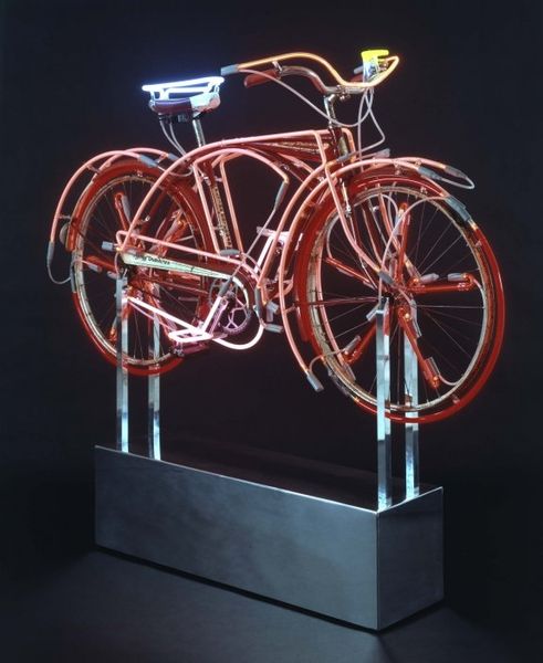 Editor: This is Rirkrit Tiravanija's "Untitled" from 2001, a mixed-media assemblage. It features a bicycle integrated into a wooden grid structure. I'm struck by the sense of impermanence, like a fragile shelter. What do you see in this piece? Curator: I see a critique of globalization and the shifting nature of cultural identity. Tiravanija often uses readily available materials, suggesting a DIY, nomadic aesthetic. This work reminds us of the makeshift structures and transport methods prevalent in developing nations, places deeply impacted by global economics. What does the bicycle signify to you in relation to this structure? Editor: Perhaps the bicycle represents mobility, a means of navigating these globalized spaces? And maybe the fragile structure symbolizes the precariousness of such existence? Curator: Precisely. It’s also relevant that Tiravanija is Thai, and his work often explores themes of cultural exchange and displacement. Consider how the work exists within the legacy of colonialism, influencing migration and impacting material conditions. Does the use of found objects here have anything to say about power structures? Editor: Possibly, a subtle commentary on resourcefulness, adapting what's available in the face of unequal distribution? It also reminds me a bit of arte povera, transforming everyday items into something thought-provoking. Curator: Exactly. It encourages us to consider who has access to resources and how art can be made from almost anything. What do you think the implications are for community building when art is so accessible? Editor: I guess it could inspire collaborative art practices and challenge traditional notions of what art should be. I now see beyond just the visual arrangement of forms and recognize that Tiravanija wants to ignite dialogues about global interconnectedness, cultural identity, and social agency. Curator: And the role of the viewer! It is exciting to consider how an art object is completed in our individual encounters with it.
