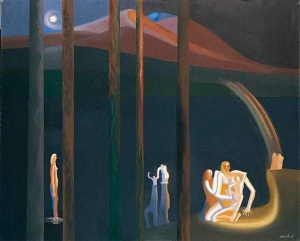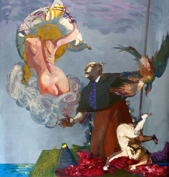 Editor: So this is Victor Brauner's, *Hypergenese de la reapparition*, painted in 1932 using oil paint. It has this really dreamlike, or maybe nightmarish, quality. Almost like figures are emerging, or falling, from a single source. What do you see in this piece? Curator: I see layers of symbolic language being unearthed. Notice the figure at the top, standing rigidly in formal attire. Is it a source of order or control, perhaps an authority figure dispensing—what? What do you make of what emanates from him, transforming into these other bodies? Editor: They’re almost tumbling downwards… or maybe being born? It's strange because they seem to be forming amidst these…rocks? It almost looks like he’s creating them, or at least initiating some kind of chaotic creation process. Curator: Exactly. Rocks are the symbol of matter and hard, enduring truth, the Earth and what it sustains. Brauner masterfully juxtaposes the grounded reality represented by the rocks with the surreal figures coming into being, suggesting the transmutation of ideas, maybe the psychological birth of anxieties or desires into something tangible. Consider the central nude female form, mouth agape. Is that a cry of pain, of ecstasy, or something in between? Editor: I hadn’t thought of that. It definitely changes the way I see it. The woman seemed passive at first, but now I'm reconsidering the raw emotion of emergence itself. Is that what reapparition refers to in the title? Curator: Perhaps, but reapparition suggests cycles, recurrence. This isn’t simply a singular birth, but an echo of a primal act, repeated endlessly. Do the other figures give you any insight into *why*? Editor: They seem caught between states. Almost like they’re being shaped and molded mid-air. The entire composition creates a feeling of transition, or constant becoming. It is like creation as an unending cycle. Curator: Precisely. Brauner challenges us to question what it truly means to exist and morphs creation to continuous "reapparition". Each element contributes to an experience which challenges notions of stability. It creates an emotionally evocative symbolic landscape.