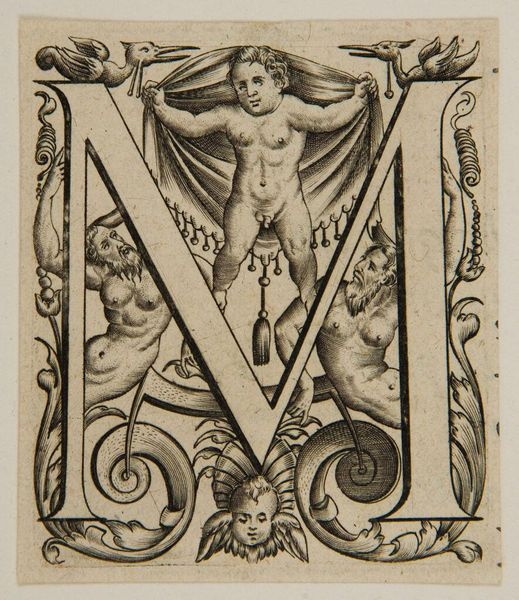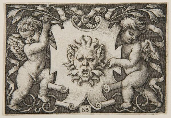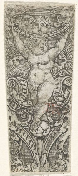 Editor: This tiny engraving, "Ornament with Female Demon" by Sebald Beham, is fascinating! The winged figure, flanked by snarling beasts, feels both powerful and unsettling. What symbolic reading do you find most compelling here? Curator: The image pulses with ancient echoes. Doesn't she remind you of Lilith, or perhaps a pre-Christian earth goddess? Note how the hybrid creatures tether her, suggesting a binding of primal feminine power. Does that reading resonate with you? Editor: Absolutely. The demons feel less like adversaries and more like guardians, emphasizing the containment you mentioned. Curator: Precisely. Beham offers a glimpse into the complex negotiation between burgeoning humanism and lingering pagan beliefs. The ornament becomes a potent vessel. Editor: It's incredible how much meaning is packed into such a small space. I'll definitely be thinking about the persistence of symbols.
