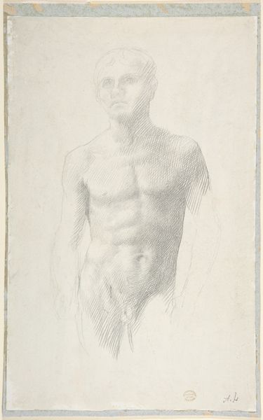 Curator: Just look at this. "Study of a Standing Male Nude: Saint Sebastian," likely from the mid-17th century by Jacopo Confortini. It’s a pencil and charcoal drawing, a preparatory sketch perhaps, but so full of life. Editor: There's an inherent vulnerability in a nude figure, and this piece captures that, but there’s also defiance. The subject's stance seems almost casual, though his arms are bound. I find the contrasting tones quite compelling; it is baroque. Curator: It’s a tension Confortini so masterfully balances, isn't it? Sebastian, the martyr, often depicted riddled with arrows, becomes an emblem of resilience. Yet here, he's a man stripped bare, figuratively and literally. I’d also call it portraiture. Editor: Indeed. Considering this work in its historical context, we see the evolving relationship between the Church, the state, and representations of the body. Saint Sebastian’s image becomes a battleground for cultural values and ideals of masculinity. Is this Sebastian anticipating the arrows to pierce his body, or reflecting after survival? Curator: Good question. Perhaps both? The ambiguity heightens the emotional resonance, doesn't it? I’m also drawn to the artistic process visible here—the layering of pencil and charcoal. You see the artist searching for the form, almost like an act of discovery. A bit rough, maybe? Editor: The artist seems unafraid to reveal his process. It democratizes art, or at least the idea of it, which otherwise seems so codified and austere when viewed, centuries removed, in this quiet hall. I find it very direct, if not intimate. Curator: Exactly. He's rendered beautifully yet brutally. A god made mortal or vice-versa. To me, there is also a homoerotic subtext; how does that connect with martyrdom? It is the nature of pain versus a path to salvation through suffering, which gives it profound meaning. Editor: And by unveiling the power structures and the politics of pain represented in art, we can begin to better understand not only the art of the past but also our present condition, particularly how museums like this one curate an interpretation of those pasts. Curator: It makes one pause, contemplate, even reconsider the weight of cultural baggage we bring to art and museums and what their lasting impression is on our subconscious selves. A fine feat for one simple drawing. Editor: I’m struck how a single artwork can act as a nexus for history, art, belief, doubt, power, fragility and offer a compelling lens for analyzing ourselves as active observers.