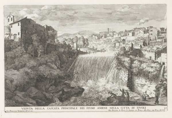 Editor: Here we have Giovanni Francesco Venturini's etching, "Landschap met waterval en tempel van de Tiburtijnse Sibille te Tivoli," dating roughly from 1653 to 1691. It's incredibly detailed, but also feels like a romanticized view. What stands out to you about this depiction of Tivoli? Curator: The image highlights a very particular tension of the Baroque era: the relationship between the classical past and the modern, developing world. Venturini gives us not just a landscape, but a curated view of civic identity. What purpose did prints such as this one serve in that period, do you think? Editor: Perhaps to promote Tivoli? Almost like early tourism propaganda, showing off the beautiful ruins. Curator: Precisely. This print, along with others of Roman sites, became very popular souvenir for wealthy European travelers undertaking the Grand Tour. Note how the Sibyl's Temple is prominently positioned, but the rest of the built environment is… not as impressive. Is that an accurate depiction, or is Venturini communicating something specific about Tivoli’s status at the time? Editor: I see your point. There’s a contrast there. The glorious ruin versus… well, just regular buildings. Almost implying that the town has fallen from its former splendor? Curator: Exactly. Consider, too, the role of patronage. Venturini likely made this for sale, thus, he would adjust his view based on what was considered valuable and how the site should be seen in the public eye. How does acknowledging its social purpose affect your understanding of the artwork? Editor: It definitely moves it away from just being a pretty picture. It gives it an argument, a perspective rooted in the culture of the time. I will never see a landscape in the same way again. Curator: Indeed. Paying attention to the forces surrounding artistic creation, whether it's economics or politics, reveals so much about the meaning of art.