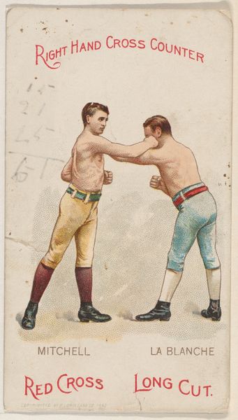Editor: Here we have "Infighting, Walter De Baum and Walter Campbell," from 1893, a print created by P. Lorillard Company, using colored pencils and drawing. It’s incredibly raw, almost like a snapshot of two boxers in the heat of a fight. Very immediate, wouldn't you say? What do you make of it? Curator: Immediate indeed, like catching a secret glimpse. I find it so curious, this merging of sport, art, and… well, commerce. The boxing scene, presented as an ad for tobacco, smacks of turn-of-the-century virility, doesn’t it? A bit crass, but visually, quite engaging. And these almost delicate color pencils trying to catch all this raw force… The juxtaposition intrigues me endlessly. What’s your read on the color usage? Editor: I was struck by the limited palette and the, dare I say, slightly awkward anatomy? Is it intentionally naive or a stylistic choice? Curator: A little of both, I fancy! Accuracy wasn’t the point, was it? This feels like a stylized drama, where bold gestures matter more than details. This reminds us to look at art for how it affects our heart and gut feelings, and what meanings, narratives, feelings, thoughts, or questions can be ignited in our soul… It can also give some food for thought that ads and art don't necessarily live on different planets, after all. Editor: So it's more about capturing the energy of the match than creating a precise representation. Fascinating! It makes me reconsider the purpose of commercial art entirely. Curator: Precisely! It invites us to question what we consider 'high' art, blurring those boundaries. Makes you wonder what other hidden narratives might be lurking in seemingly mundane objects, right? I might just start collecting vintage ads myself!