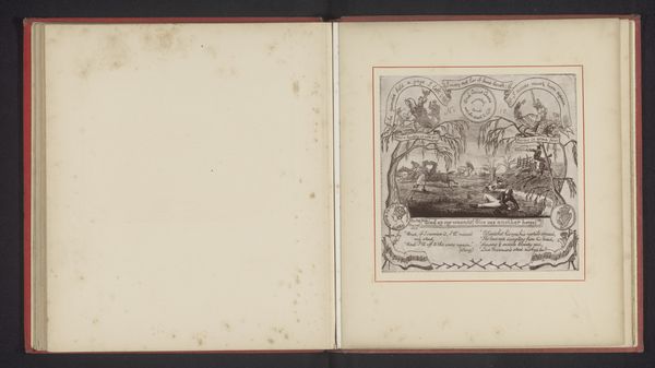Curator: Let's consider this drawing, made before 1885, a reproduction of a work by Thomas Mervyn Bouchier Marshall. It depicts people on horseback amidst heraldic shields. What catches your eye? Editor: Instantly, the dynamism! It's as if the scene is bubbling with suppressed energy—the horses splashing through the water, the little poems scrawled around the image… it feels both meticulously planned and strangely whimsical. Curator: Indeed. The image pulsates with layers of meaning, as the animals themselves are icons representing virtues such as courage, loyalty, and nobility—the horse pre-eminently so. These traits are augmented through the surrounding shields as well. The scene suggests movement across a boundary of transition and the idea of leaving the familiar and seeking something beyond. Editor: That makes me think about "crossing the Rubicon," that daring move in history… Though it has a fairytale vibe too, you know, that sense of perilous journey and adventure, with symbolic animals leading the charge. I'm quite charmed by the way he places the image inside a frame, then embellishes everything with words and decorative objects that have narrative weight as well. Curator: It's a landscape, really, designed to tell a particular kind of story and establish a particular reading of history and self-understanding. Landscape imagery allowed artists to distill these principles as they became meaningful in daily life and national consciousness. So many landscapes incorporate emblems into the image or heraldry into its border or composition! Editor: You know, looking closer, I wonder if the rather old-fashioned heraldry and its references indicate some subtle humor or irony by the artist, given the overall composition and playful line. Perhaps he wanted to question such values… Curator: A possibility worth entertaining, given the context of when this was produced, toward the end of a century grappling with rapidly shifting cultural touchstones. We can almost hear that gentle mocking echo here, especially since reproduction was also taking place at unprecedented rates... It seems to encourage a complex appreciation. Editor: I like that so much: a call for appreciation and thoughtfulness! Thank you; that opened a new portal into the image for me.