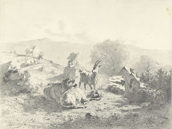 Editor: This is Anton Mauve’s "Cows by the Water, with a Sailing Ship in the Distance," a watercolor piece from 1855, currently residing at the Rijksmuseum. It has this faded, almost dreamlike quality. The cows seem more substantial than the distant ship, which is funny. What stands out to you when you look at this? Curator: Dreamlike, exactly! It’s like peering through a memory. I love how Mauve uses the muted tones to create this atmosphere of quiet contemplation. The cows, solid and present, contrasted with that ghost ship…it’s like the tangible present versus the distant promise of escape. Doesn't the limited palette feel a bit like an old photograph, tinged with nostalgia? Editor: It really does! Did he usually work in watercolor? I get such a different feel from this compared to some of the richer oil paintings of the Dutch Golden Age. Curator: Mauve loved painting en plein air, and watercolor was perfect for capturing those fleeting moments outdoors. While rooted in realism, there's this undeniable hint of Impressionism peeking through, wouldn't you say? Like he’s more interested in the feeling of the scene than photographic detail. You can almost feel the dampness in the air. What about the cows? Any thoughts? Editor: They definitely seem at ease! There's a calm I wasn't expecting. Perhaps it is from the earthy colors? Curator: Indeed! And notice the circular composition. How do you think it affects the piece? To me, it’s embracing everything, which brings everything to a gentle close. It adds to that sense of intimacy, drawing you in to witness this tranquil moment. I like to imagine I'm there on that ridge with them! Editor: I hadn't thought about that. Thanks! I think I understand a little better now about finding stillness. Curator: Anytime! You opened my eyes too by sharing.