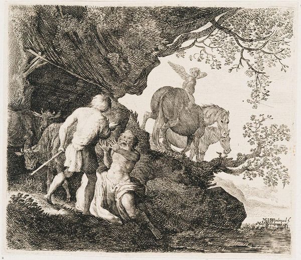 Editor: This is Jean Louis de Marne's "Cows and Goats with Two Peasants," its date unknown. I find the etching quite charming, like a scene from a pastoral dream. What do you make of it? Curator: Charming is a perfect word! It's as if de Marne is inviting us into a quiet, sun-dappled moment. I’m immediately drawn to the textures he creates with the etching technique. Look at how he differentiates the rough coat of the bull from the soft fleece of the lamb. It's almost tactile, isn't it? Editor: Absolutely! It’s subtle, but it adds so much depth. I hadn't noticed that before. Curator: Art reveals itself layer by layer! I think this piece whispers of simpler times, a world that maybe existed more in the imagination than in reality, but it is pleasant to look at. Editor: That's lovely, a dream of simpler times. I'll definitely remember that.