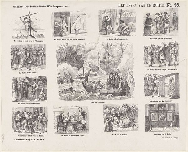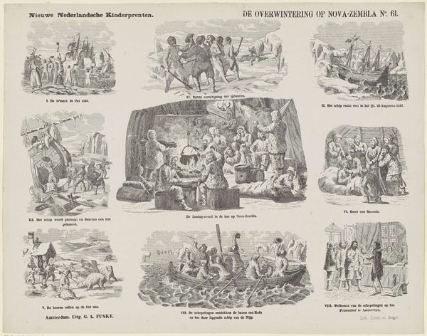 Curator: Hello! Welcome, so glad you're here today to talk about "Geschiedenis van Roodkapje", or "The Story of Little Red Riding Hood" by George Lodewijk Funke, dating back to sometime between 1865 and 1875. What catches your eye initially? Editor: I’m fascinated by the way the story unfolds across these little scenes. It reminds me of a comic strip, almost. I’m curious about the choice of using prints – what does that medium bring to the narrative? Curator: Ah, excellent observation! The choice of prints, specifically engravings, offers a unique lens. Imagine a world where color wasn't easily accessible for mass production. These prints became vital tools for educating and entertaining children. Look closer; see how each frame captures a key moment? Almost like the theater, wouldn't you say? What emotions do the stark black and white evoke in you? Editor: There’s a simplicity to it, but also a starkness. The wolf looks… very wolf-like! It makes the danger feel real. But why present it this way, rather than just telling the story? Curator: Precisely! By visually depicting each scene, it reinforces moral lessons. "Stay on the path!" and "Don't trust strangers" become indelibly etched in a child's mind. Do you think children today would connect with this cautionary style of storytelling? Editor: I'm not sure! The images feel more serious, less whimsical, than modern fairy tale illustrations. It's less about fantasy, maybe more about warning. Curator: Perhaps you're onto something. Let's appreciate Funke’s commitment to making this story broadly available to teach the value of safety and, maybe, just a touch of obedience. It’s certainly a unique window into the 19th century's approach to educating youngsters, don't you think? Editor: Definitely. Seeing it this way makes the story feel more grounded and relatable. It has given me so much food for thought.