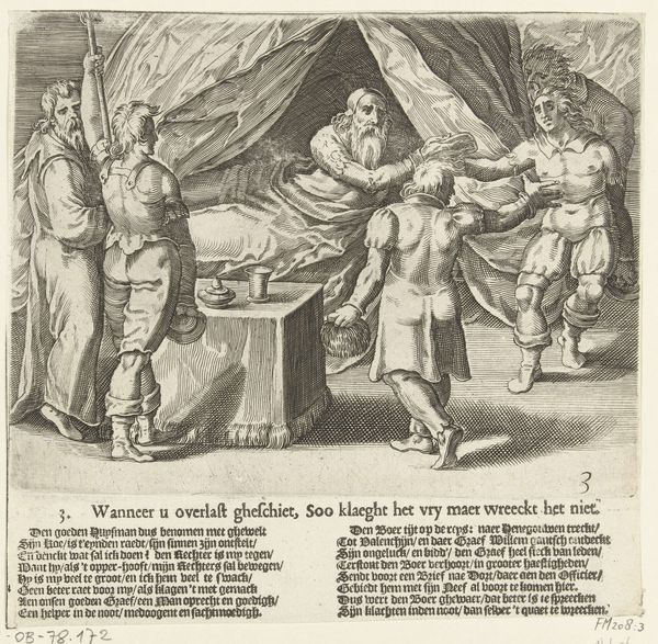 Curator: This engraving by Crispijn van de Queborn, from 1643, depicts Hipparchia and Krates, now held in the Rijksmuseum. The entire piece strikes me with its simplicity and lack of ostentation, despite clearly representing an upper-class interior. Editor: It feels somewhat claustrophobic. The horizontal lines of the paneling and the figures being crammed in...there's something stiff about its spatial arrangement, almost purposefully anti-perspectival. What catches your attention most formally? Curator: I am drawn to the contrasting textures Queborn manages to evoke. Notice the precise lines used to define the volumes of the clothing. Hipparchia’s dress has a beautiful cascading rhythm of light and shadow as her robes fall into swaths on the floor, and that bundled cloth near Krates--it has an astonishing softness despite being rendered entirely in hard lines. How is this accomplished with simple tools? Editor: And it’s these "simple tools" that interest me! Engraving is additive; a whole process. To achieve softness the artist needed skilled engravers who had acquired experience to properly incise metal in tiny movements—the tools themselves tell of knowledge exchange throughout generations in workshop settings. The contrast you note could indicate varying degrees of specialisation across collaborators in Queborn’s studio. The engraving becomes a record of embodied skills within the system of print production. Curator: Perhaps, but consider the intellectual concept! The positioning of the text gives an explanation of the picture—in this scene, Hipparchia is turning away from a more traditionally luxurious life—symbolized by the renounced objects around her, rejecting the social expectations of the time. The visual and literary aspects of the engraving work hand-in-hand to communicate complex philosophical notions about autonomy. Editor: I'm drawn to those cast-off trappings, the robes in particular. Their rumpled state reminds us that materials hold stories of prior use—labor, wear and tear—a stark contrast to how value is usually conveyed through clothing depicted in this period’s more idealized portraits, which so carefully masked such lived-in quality. It’s the unglamorous aspect, the discarded fabric, that pulls you into another social orbit that valued different objects, and therefore, labor. Curator: I find myself moved by the quiet strength suggested by the image combined with the poem—her devotion is clear, even understated, emphasizing an emotional depth. Editor: I agree; examining the material transformation illustrated in the scene provides another means for entering these early social tensions, too, prompting us to examine not just ideas, but lives materially impacted in subtle ways by radical life decisions like this one.