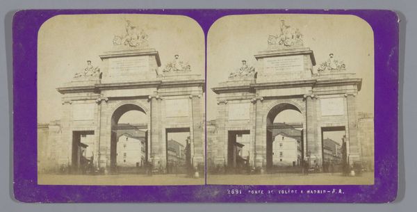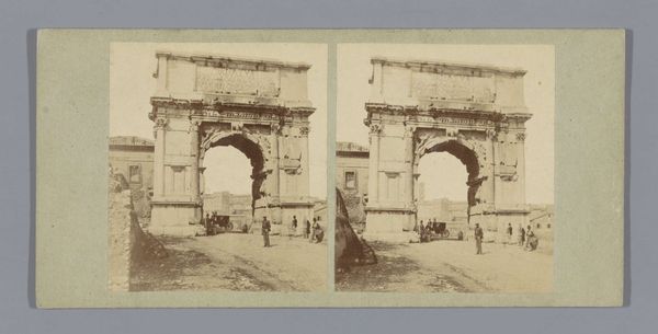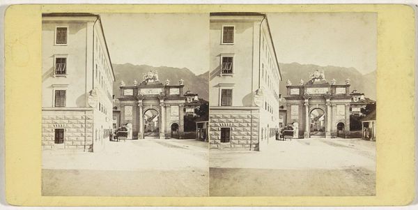 Editor: Here we have Johann Friedrich Stiehm’s "Noordzijde van de triomfboog in Innsbruck," a gelatin-silver print from sometime between 1868 and 1890. I'm struck by the framing, which repeats this triumphal arch twice in one photograph! What historical weight does the photograph carry, in your opinion? Curator: This stereoscopic image is interesting as a form of early tourism and city documentation. Triumphal arches themselves are intensely political. Erected initially by empires, then monarchies, to celebrate military victories and project power, Stiehm captures Innsbruck's arch at a time of shifting imperial dynamics. Editor: Shifting? Could you say more? Curator: Well, consider how photography itself, rapidly becoming more accessible, changes the nature of public monuments. Suddenly, images like this allowed wider circulation of state symbols, creating new forms of national or regional identity. Was Stiehm, do you think, merely documenting, or participating in constructing Tyrolean civic pride? Editor: That’s fascinating. The photograph as a political actor, not just a recorder. Do you think the choice to use the stereoscopic format also contributes something to that message? Curator: Absolutely. The added depth arguably reinforces the monumentality and permanence of the arch. Think about how these images would have been viewed – through a stereoscope, often in domestic settings, almost like bringing a piece of Innsbruck’s political landscape into the home. What assumptions do you think viewers brought to images like these at the time? Editor: I guess they saw progress, empire, the state, made accessible. But also maybe a bit staged, considering photography’s history. It feels less like a candid shot and more like a controlled presentation of power. Thanks, I never thought of these photographs carrying a message! Curator: Exactly! It encourages us to be critical viewers, aware of the context and intentions embedded within even seemingly straightforward depictions of cityscapes.