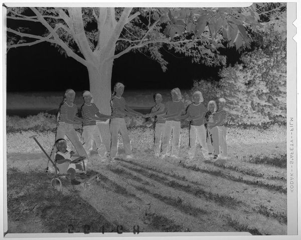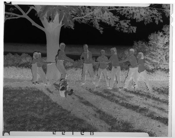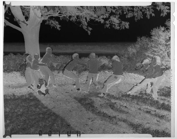 Editor: This intriguing, undated photograph by Martin Schweig, titled "Untitled," shows children playing tug-of-war. The negative print lends it a dreamlike quality. What symbols do you see present in this image? Curator: The tug-of-war becomes a potent emblem here. Note how the matching stripes unify the group, but also reveal the individual efforts. The infant becomes a symbol of our future generations, watching the contest. Editor: That is interesting! What is the cultural weight of that choice? Curator: It serves as a reminder that cooperation and competition shape our world, the infant watches, but will soon participate. The game itself is a symbol of social dynamics, of balance. What do you think? Editor: I hadn't thought about the infant as a future participant! It adds another layer to the meaning. Thanks! Curator: These visual symbols hold cultural memory and continuity, offering a glimpse into our shared experiences, what a fun way to look at art.