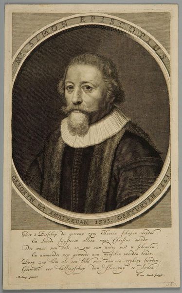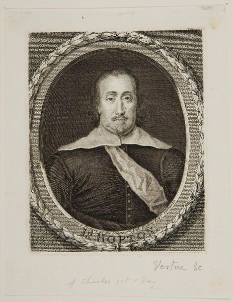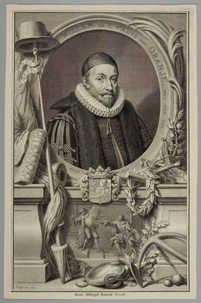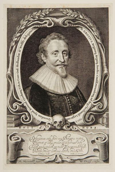 Curator: This engraving, titled "Hugo Grotius", was created by Jacobus Houbraken. The piece strikes me as somber, its tones achieved through meticulous lines. Editor: As an engraving, the work implicates a whole workshop tradition. We have the hand of Houbraken, yes, but consider the paper itself, likely manufactured in a specific mill, part of a global trade network. And what about the economics of portraiture at the time? Curator: Certainly, portraiture was tied to social status. Grotius, a Dutch jurist, appears framed in an oval, perched above an inscription. This was intended for public dissemination, furthering his legacy. Editor: I'm interested in the inscription itself. The materiality of the printing process allowed for the combination of image and text, shaping the reception of Grotius within a specific intellectual circle. Curator: I agree. The printing facilitated the spread of ideas and the construction of Grotius's image. The work also reflects the social function of art at that time. Editor: Precisely. It reminds us that what we perceive as "art" is always the product of specific material and social conditions.