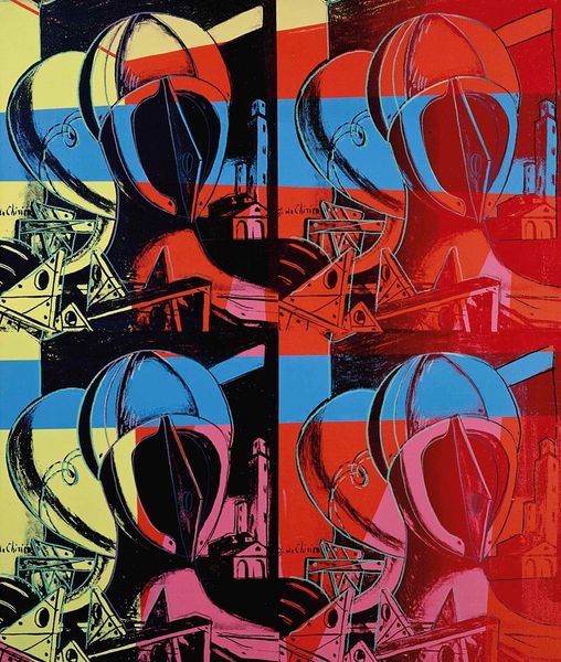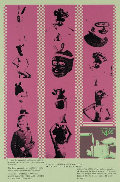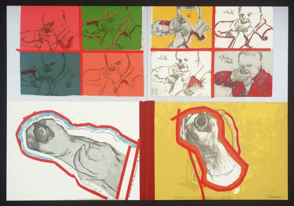 Editor: So, this is Sir Eduardo Paolozzi's "Secrets of Internal Combustion Engine" from the Tate collection. It's a print, bursting with pop colors and strange juxtapositions. It feels…fragmented, like flicking through TV channels. What do you make of it? Curator: Fragmented, yes! Like a collage of the subconscious. Paolozzi was fascinated by the onslaught of mass media. See how he sandwiches the cool, distant faces above the cold mechanics and childlike toys? It’s a clash of high and low culture, isn't it? The cogs of progress grinding alongside our innocent pleasures. Almost unsettling, what do you think? Editor: I guess so. I hadn’t really thought about the contrast between the different layers before, but that makes sense. Curator: It speaks to the seductive and sometimes sinister nature of technological advancement. The way it shapes our desires and, perhaps, our very identities. It’s a wild, kaleidoscopic ride! Editor: Definitely gives you a lot to chew on. Curator: Indeed! Paolozzi reminds us that the secrets are not just in the engine, but in ourselves.