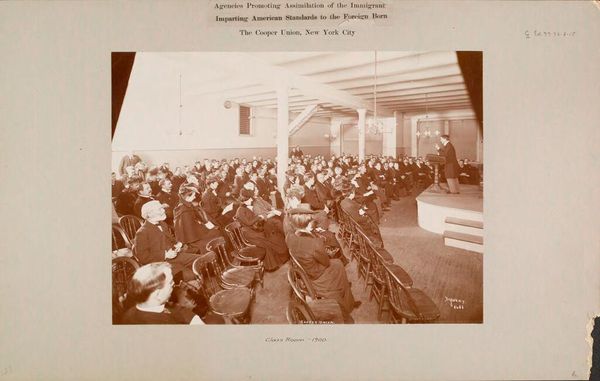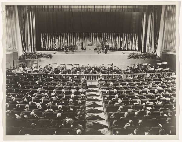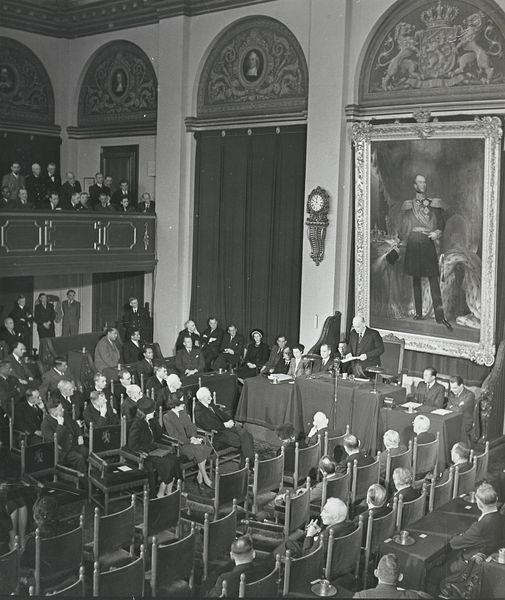 Editor: Here we have a photograph, "Huwelijk van Juliana, koningin der Nederlanden, en Bernhard van Lippe-Biesterfeld in de Grote Kerk te Den Haag op 7 januari 1937," taken presumably on that date. It shows a large gathering. The overall tone feels quite formal and, well, public. What strikes you about this piece? Curator: Well, immediately I see a careful orchestration of power and visibility. It's not just a wedding; it's a highly staged representation of the Dutch monarchy at a pivotal moment. The print serves less as a memento, and more as political spectacle carefully presented for public consumption, wouldn't you say? Consider the historical context. Editor: Could you elaborate on that pivotal moment? Curator: Absolutely. 1937 was a time of rising political tensions in Europe, just before the second world war, when royal images were essential in stoking nationalism and solidarity. A royal marriage was a moment to demonstrate strength and stability. Look how everyone is arranged and the sheer volume of attendees; it communicates a certain message about influence and endurance, not merely happiness. Don’t you agree that such control serves an important cultural and sociopolitical function here? Editor: I see your point. It’s interesting how a seemingly personal event can be so thoroughly constructed for public consumption. So much symbolism! It does really shift the reading of the piece for me, it goes beyond simply documentation to active political message. Curator: Precisely! That understanding adds depth. What new appreciation will you take from that realization? Editor: Definitely an appreciation for how historical context fundamentally shapes how we view these representations of historical events. I'll never see wedding photography the same way again. Curator: Nor I! It's enriching to consider the multi-layered significations beneath the surface of art, isn’t it?