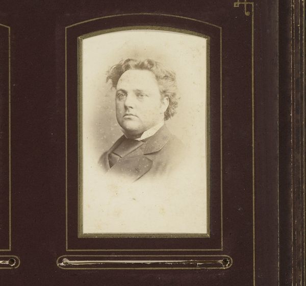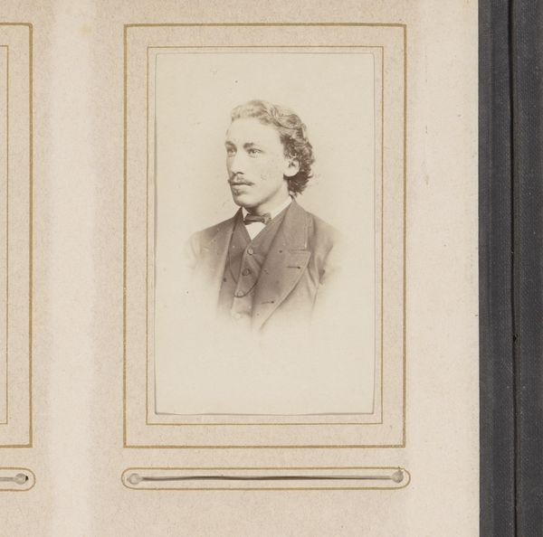 Editor: We’re looking at a photographic portrait, “Portret van een man met snor en vlinderstrik,” dating from around 1860 to 1900, likely an albumen print. It's faded and marked with age. What I find interesting is the contrast between the sitter’s carefully chosen attire and the degraded state of the print itself. What's your take on this piece? Curator: Considering it as an albumen print, we must consider its historical construction, this print being made with egg whites is fascinating. This material choice highlights the merging of domestic craft with burgeoning photographic technologies of the period. What does it reveal about the labor involved? The labor not just of the photographer, but also the unseen hands that prepared the materials? Editor: That’s a really interesting point – I hadn’t considered that. Curator: And then there's the social context. These kinds of portraits became increasingly common. It democratized representation, allowing people beyond the elite to fashion a visual identity for posterity. Think of this object as part of a rising culture of mass image production. Who was this man? How was his image consumed? Editor: So, it's less about the artistic intention and more about the entire system that created the image, from material to market. Curator: Precisely. This image exists not just as a portrait but as a node within a larger network of social, economic, and technological forces. Do we see the intersection of individual aspiration and industrialized process? Editor: That’s a valuable way to look at something that, at first glance, seems so simple and straightforward. It provides a new lense into the cultural implications of early photography and representation. Curator: Absolutely. By centering our focus on the materials and processes of its creation, we are led to question the image’s perceived value, not as art alone, but as a social and historical artifact.