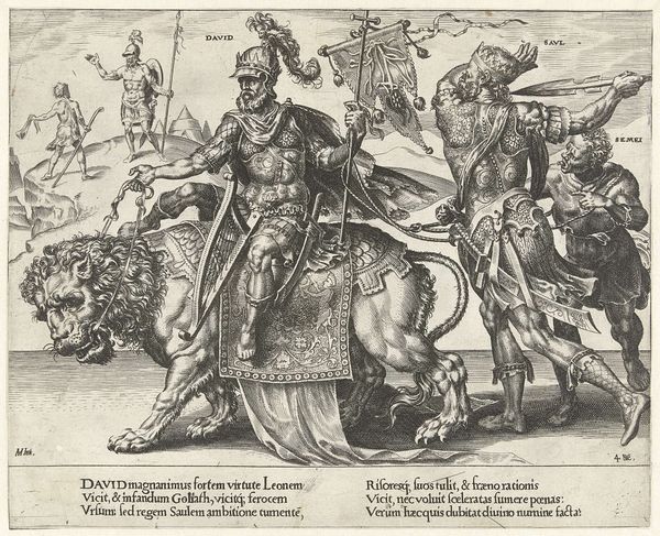 Curator: Look at this fascinating engraving, "Triumph of Stephen," crafted in 1559 by Dirck Volckertsz Coornhert, currently held at the Rijksmuseum. It's quite the piece of Mannerist printmaking, wouldn't you say? Editor: Intricate, yes. But the first impression is one of strange contradictions. You've got this incredibly detailed, almost rigid central figure on an elephant, while chaos and tension seem to tug at its stability from behind. What symbolic language do you read in these opposing forces? Curator: I find Coornhert is layering several political statements in this piece. Stephen, a figure who met his end through violence, rides an elephant – an animal historically associated with both wisdom and, crucially, royalty. But the men pulling the elephant look very muscular and pained, which implies that history is full of those using violence to subvert wise and royal intention. The cloud of witnessing angels is also an indictment of the acts committed. Editor: Right, the figures who we can presume are doing violence have almost classical musculature. Is this supposed to glorify brute strength? Curator: It does at first seem counterintuitive. However, in the 16th Century visual vocabulary, to give one’s enemies such robust treatment would imply they represent not the working classes, who often perpetrated physical attacks at the command of landowners, but something darker – a classical ideal perverted for evil intent, an active desire for brutality to undermine social progress. Consider the context: religious conflict was exploding all across Europe at this time. Coornhert himself was embroiled in debates around freedom of conscience. His art often functioned as an intervention, advocating for tolerance amidst strife. He used allegory to expose these moral hypocrisies in ways that resonated deeply. Editor: So you're suggesting Coornhert weaponizes classical visuality. What seemed an imposing monument, now looks more like the portrait of broken resistance, which then speaks more directly to religious upheaval? Seeing the geometric and organized detail in contrast to the emotional scene…it evokes a sense of melancholy for what has been destroyed in the name of religion. Thank you for showing me a deeper sense of struggle. Curator: Absolutely! The beauty of art like this lies in its multifaceted reading, and its connection to history allows us to unpack complex social and political struggles, in turn informing where our future path can take us. Editor: Agreed, the symbols aren't static; they keep accruing resonance. Understanding that continuity is how we build something new.