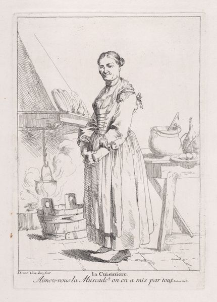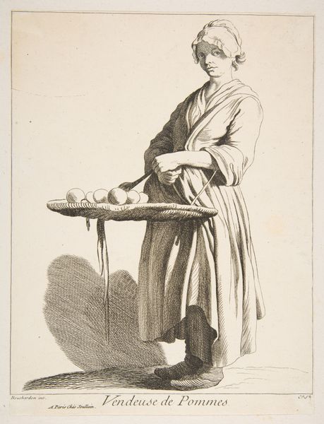 Editor: Carl Bloch’s 1882 etching, “The Grocer at his Counter,” has a certain austere quality. The detail in his face is incredible for a print! What do you see in this piece from a formal perspective? Curator: The interplay of light and shadow, achieved through the intricate network of etched lines, constructs both form and texture with remarkable precision. Note how the varying densities of these lines articulate the grocer's furrowed brow and the subtle gradations on his apron. Editor: Yes, and there’s a definite contrast in textures. His face and hands are heavily detailed but the background almost disappears! Curator: Precisely. The artist manipulates visual information strategically, prioritizing texture and the formal relationships between line, tone, and shape within the composition. Consider the deliberate arrangement of the still life elements: bowls of indistinct edibles are horizontally composed and counterbalanced by the vertical orientation of the grocer. Editor: So, the composition isn’t accidental? It's carefully designed with visual balance in mind. Curator: Indeed. Notice also how the composition employs tonal contrasts. It enhances depth and establishes visual hierarchies. The manipulation of these elements underscores a clear artistic intent and transforms the mundane subject into a sophisticated arrangement. Editor: This has totally reshaped my perception. I had missed all these subtle artistic decisions focusing purely on the representational element. Curator: Observing the form refines the perception, doesn't it? Every element contributes meaningfully. Editor: Definitely. I now appreciate how technique itself generates layers of content and aesthetic quality in a work like this!