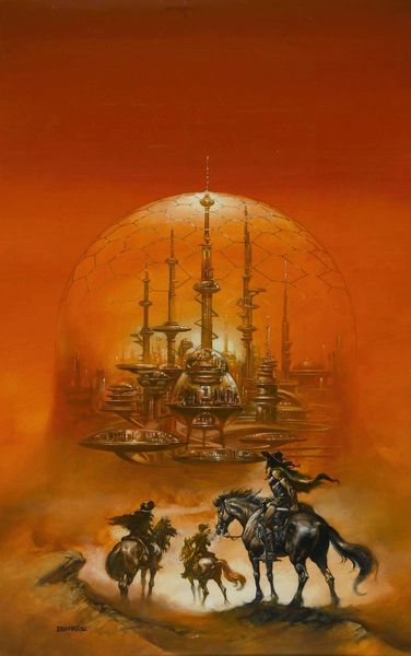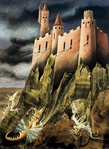 Editor: This piece is an untitled matter-painting by Zdzislaw Beksinski, created with oil paint, and what strikes me is the immense scale combined with the decaying details. The texture created by the impasto gives it an almost tactile sense of ruin. How would you interpret this work from a formalist perspective? Curator: The formal properties command attention, certainly. Note the artist’s calculated arrangement of the visual elements. Consider the stark contrast in texture: the smoothness of the atmospheric rendering against the heavily worked impasto in the ruins and foreground. Ask yourself what meanings these formal oppositions produce? Editor: It’s true, the contrast creates tension. The smoothness almost feels like an artificial serenity layered on top of the chaotic texture. The rounded forms in the 'buildings' too contrast sharply with the flatness of the lower ground. Do you see the forms of these 'buildings' as purely abstract or do they hold representational value too? Curator: The forms themselves can be analysed through the lens of geometry and perspective. Consider the implications of the vertical thrust, versus the implied horizontality of the landscape, then evaluate what those might signify in terms of power or fragility, and the semiotic relations inherent within. Is there one predominant element, or a dispersal? Editor: I see what you mean. The dominance of verticality and the decay both create conflicting signals of ambition and futility, or perhaps warning about what's coming? So, focusing on these contrasts opens up new interpretative pathways that rely solely on the artwork itself. I understand the formalist approach so much better now, seeing the image in terms of those qualities first. Curator: Indeed. Formalism encourages us to consider art’s internal structure and the effects it generates, divorced from external context and personal affectations. Hopefully this encourages more precise observation.