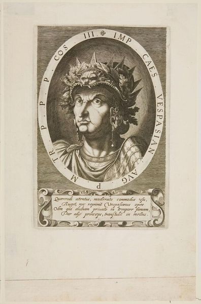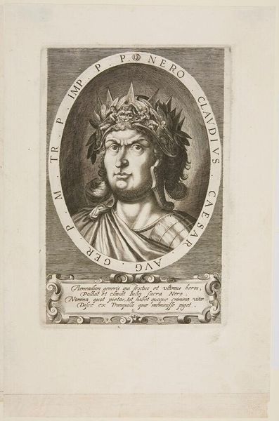 Curator: This is Wolfgang Kilian's engraving of Galba, a Roman emperor, currently housed in the Harvard Art Museums. It's a striking piece. Editor: It certainly is! The portrait has a sternness to it, almost a world-weariness etched into those finely detailed lines. Curator: Kilian was working within a well-established tradition of depicting Roman emperors, thinking about power and representation. How would Galba himself have viewed this image? Editor: Right, because Galba’s brief reign was marked by political instability; this idealized image contrasts sharply with the historical accounts of his unpopularity and violent death. Curator: The inscription below adds another layer, hinting at themes of lost hope and betrayal. Editor: The image and text certainly offer a complex commentary on power, legacy, and the inherent instability of leadership. Curator: It's a potent reminder of how carefully crafted visual narratives can be. Editor: Indeed, a fitting end to our encounter with Galba.