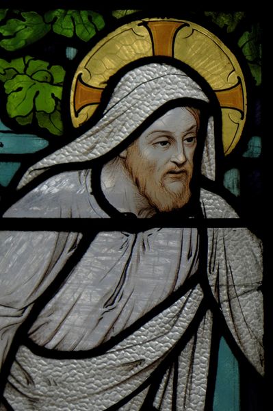 Curator: Looking at this, I’m immediately struck by the stark contrasts in color. The cobalt blue against the faded rose—there's a striking intensity despite the age. Editor: Indeed. What you are observing is a detail from the stained glass of "Jesus and the Samaritan Woman" within the Église Saint-Sulpice de Fougères. The piece dates back to 1919 and is the work of Ludovic Alleaume. Its academic and symbolic elements speak to its religious function. Curator: Symbolic, yes, but beyond the narrative function, observe how the lead lines structure and almost trap the figures. The downward gaze of the Samaritan woman adds to this effect, contributing to an atmosphere that's undeniably heavy. Editor: The narrative, steeped in cultural history, adds layers to our understanding. Consider the radical nature of Jesus engaging a Samaritan woman during that era. This was a direct challenge to the social hierarchy and purity laws upheld by the religious establishment. Curator: Absolutely. Alleaume successfully uses the glass medium, the visual structure itself, to portray this feeling. Her slightly bowed head and clasped hands give a strong sense of deference and supplication. And in combination with the placement in the windows, there is also a sense of her being looked down upon, as an outsider to the place. Editor: The piece echoes prevalent societal expectations. Though presented as an act of compassion, the scene reiterates established gender and cultural norms. A public acceptance by religious places—reinforcing what was seen as truth at that time. Curator: Even through its formal choices. I appreciate the vibrant jewel tones used for the woman, especially for her dress. It contrasts powerfully with her head covering and pale features, immediately drawing my attention to her presence within the artwork. Editor: Precisely! Through that dynamic of material, construction, and portrayal, Alleaume's piece operates as a prism through which we understand the intersection of faith, gender, and cultural acceptance at the turn of the century. Curator: I hadn’t thought about it like that, and the play of light definitely invites further consideration into that complexity.