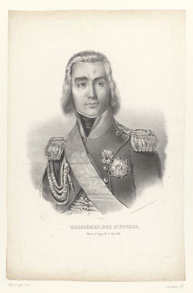 This is Nicolas Maurin’s portrait of Jean-Baptiste Bessières. The lithograph print presents a striking study in contrasts, both in its tonal range and compositional elements. The subject's gaze is directed slightly off-center, drawing us into the intricate details of his uniform, rendered with meticulous precision. Note the stark contrast between the sharply defined lines of Bessières' jacket and the soft, almost ethereal quality of the background. This interplay creates a dynamic tension, as if the figure is emerging from a nebulous past. Maurin masterfully employs the lithographic medium to explore the semiotic language of portraiture. Bessières' posture and attire signify power and status, yet the subtle nuances of light and shadow introduce a layer of complexity, challenging any singular interpretation of his character. The print destabilizes a fixed narrative, inviting the viewer to engage in an active dialogue with the image.
