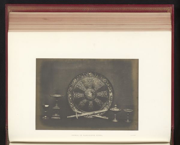 Editor: Here we have Adrianus van der Grient’s “Musical Instruments from the Collection of Daniel François Scheurleer, Exhibited at Pulchri Studio in 1893,” a photograph. There's a striking symmetry to the arrangement of instruments. What do you see in this piece? Art Historian: Initially, one observes a meticulous orchestration of visual elements. Consider how the textures interact—the sheen of the instruments against the textile backdrop. Do you find the repetition of forms generating a specific rhythm or pattern across the frame? Editor: Yes, the verticality of the wall paneling is mimicked by the hanging instruments, and there's almost a sense of musical notation suggested by their placement. Art Historian: Precisely. The photograph employs a visual language rich in signs. Let us consider the foreground elements: how do their presence anchor the composition, and how do they converse, in a purely visual sense, with the array displayed behind? Editor: I notice that the drums and pipes in the front act like a base for all the hanging instruments. Maybe like instruments in an orchestra in the front of a stage. Art Historian: That's astute. And what effect does the monochromatic palette produce, when analyzing it simply as form rather than representation? Editor: The limited range of tones directs attention to the textures and shapes; it abstracts the subject matter somewhat. Without color, it really lets you focus on lines, textures, forms. I learned a lot about composition analyzing this photograph with you. Art Historian: Indeed. Reflecting on the formal relationships—the visual cadence created by light, form, and texture—reveals a deliberate aesthetic endeavor, transcending mere documentation. It allows a deeper appreciation.