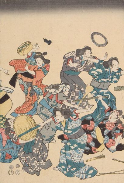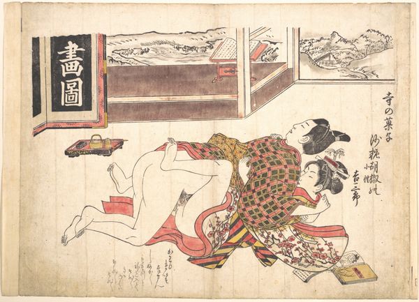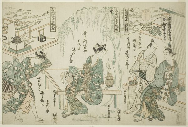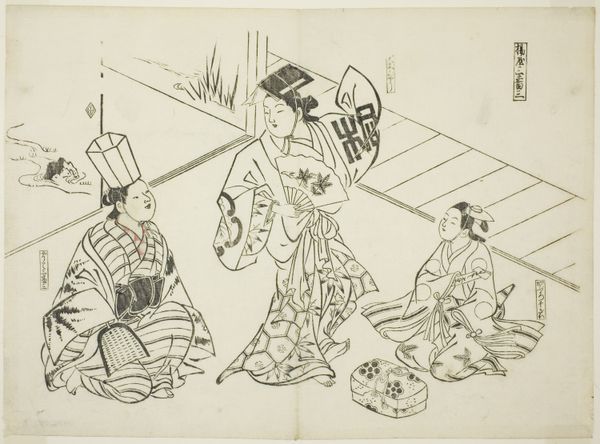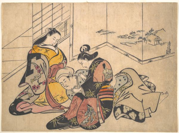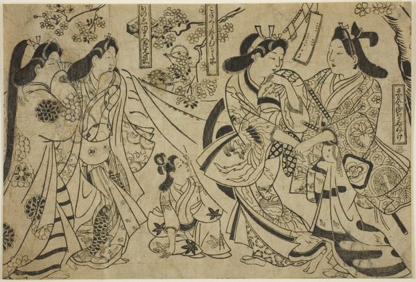 This woodblock print, "Scene from the Drama "Lyric Dance of Shizuka Gozen," was created by Torii Kiyomasu I in Japan. The composition is a tableau of figures, their placement creating a dynamic, almost musical rhythm across the surface. Predominantly, a palette of muted yellows and reds gives a warm, theatrical feel. The arrangement of figures, costumes, and props is not merely decorative; it's a complex visual code. Note the patterns on the robes – geometric shapes and floral motifs. These aren't just aesthetic choices, they are signifiers of status, role, and even emotional state. The interplay between these symbolic elements reveals the social and dramatic structure of the scene. Consider also the use of space. The figures are closely grouped yet maintain a sense of individual presence. Kiyomasu employs the formal elements to communicate narrative, social hierarchy, and emotional depth. This print invites us to see beyond the surface and decode the rich semiotic layer within.