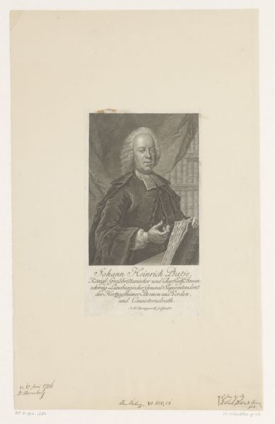 Editor: This is "Portret van Zacharias Vogel," a 1758 engraving by Gottlieb Leberecht Crusius, held at the Rijksmuseum. It's quite striking how the engraver captures so much detail with simple lines, especially in the sitter's face. What do you see in this piece? Curator: Beyond the evident skill in rendering textures and light, I see a careful construction of symbols meant to convey Vogel’s identity and standing. Consider the backdrop—a curtain and a bookshelf. These aren't merely decorative; they're visual cues indicating wealth, intellect, and social status. The book symbolizes learning, but its presence goes further. In his day and place, access to books signified the sitter's participation in the cultural dialogues that defined him. Look closely at how he is holding his hands... Do they reveal something about his occupation? Editor: His posture seems relaxed, almost scholarly, suggesting he’s used to intellectual pursuits and conversations rather than physical labor. Curator: Precisely. It speaks to a cultural ideal, doesn’t it? This engraving is a cultural artifact as much as it is a portrait. Even the elaborate script beneath the portrait itself mimics the language that marks a boundary between classes. So the purpose of portraiture serves more than the appearance. In the visual language of the 18th century, we see the aspiration for social elevation. The engraver uses that language and those social markers. Editor: So, you're saying that even an image like this, which seems straightforward, can be deeply embedded with cultural meaning. I never thought of it that way. Curator: Exactly. These seemingly simple depictions can provide such depth to understanding the values that mattered to those in the past. Each object in this frame tells a specific, constructed, meaningful story. Editor: I’ll definitely pay more attention to those visual cues from now on. Thanks for this perspective!