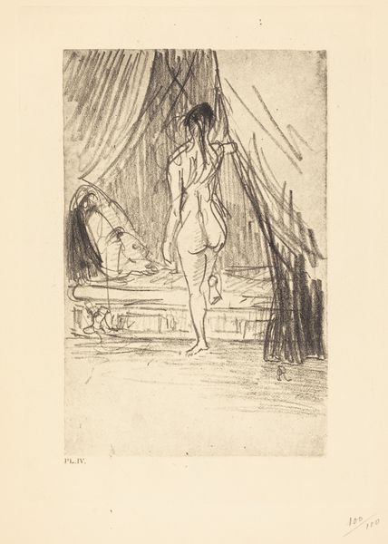 Curator: It's interesting how quickly a visual language becomes commonplace. Take, for instance, this 1796 etching by Johannes Wiedewelt titled "Nøgen kvinde med gevandt set bagfra, foran en fontæne," or "Nude woman with garments seen from the back, in front of a fountain". Wiedewelt, better known for his sculptures, especially in the royal gardens, uses the same formal language here as in his monumental works. Editor: Immediately, I sense a stillness. The pale sepia tones, the receding figure... it almost feels like we're intruding on a private moment. The hard lines creating her figure is in stark contrast with the flow of the water and draped cloth. It is quite striking. Curator: Intrusion, perhaps, but also idealization. This rendering of the female nude fits perfectly within the Neoclassical ideals that were gaining popularity at the time—recalling classical sculpture with a contemporary sentimentality. The fountain, in its idealized form, serves both as background and emblem. The architecture framing the scene lends an academic authority that permeates the period’s public role of art and socio-political image. Editor: True, the classical elements create distance. But even so, there’s a definite softness in how Wiedewelt renders the figure, particularly the curve of her back and the drape of the cloth. I get a feeling of subdued, sensual pleasure from the fountain water, the smooth urn...it is far more interesting than its objective elements reveal. Curator: Well, perhaps this tension highlights the moment's inherent contradictions. Neoclassicism tried to recapture an idealized past while negotiating the present. And, certainly, there is psychological weight imbued in its symbols, as well as emotional longing, perhaps? This approach also carries an influence of Academic Art of the time. Editor: Agreed. Perhaps its contradictions is why it draws the eye, still, after two centuries. It captures a brief and complex moment, a convergence of style, power, and cultural memory. Curator: Exactly. Wiedewelt’s rendering prompts one to reevaluate our understanding of beauty, propriety, and power, even today.