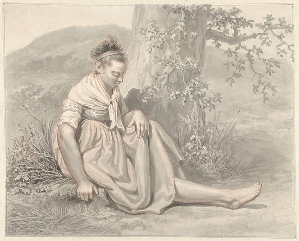 This delicate image of a seated young woman in a landscape was made in July 1815 by Jacob Ernst Marcus. It is an etching, a printmaking process that relies on the corrosive action of acid to create lines in a metal plate. Look closely and you'll see how Marcus has used a dense network of fine lines to build up tone and texture. This technique allowed him to achieve a high level of detail, capturing the folds of the woman's dress and the delicate foliage around her. The process of etching demands patience and precision, requiring the artist to carefully control the depth and density of the lines. Printmaking allowed for the wide distribution of images, making art accessible to a broader audience. In this way, Marcus's etching reflects the changing social landscape of the early 19th century, where art was no longer solely the preserve of the wealthy elite. Appreciating the labor and skill involved in the making of this print enriches our understanding of its cultural value, and challenges any distinction between fine art and craft.