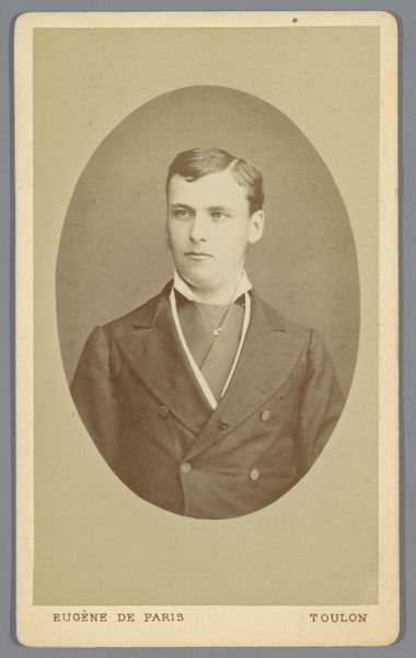 Curator: There’s a softness to this piece, a gentle quality, even though it's a commercial photograph. Editor: It's a fascinating intersection of commerce and culture. What we have here is "Donohue, from the Old Judge series (N172) for Old Judge Cigarettes," created sometime between 1887 and 1890 by Goodwin & Company. You can find it in the Metropolitan Museum of Art’s collection. Curator: The gelatin-silver print really emphasizes that bygone era, doesn't it? There’s a sepia wash over everything that reminds you this image comes from a different time. Baseball imagery takes me back to nostalgic times, too. Editor: Baseball cards such as this were a clever marketing ploy. This image is more than just a picture of an athlete; it’s an emblem of American identity in the late 19th century. Think about it—a rising sport, mass-produced images, and the popular habit of smoking. Curator: You’re absolutely right. It feels so innocent and charming on the surface, but underneath, it speaks to the rise of consumerism and mass culture. The tie, I think, represents success and pride. Editor: The name "Donohue" scrawled across the image turns him into an approachable, almost familiar figure, which surely increased sales and spoke to the general sportsmanship of the 19th century. The "Old Judge Cigarettes" stamp acts as the seal of consumer approval, in a way. Curator: These sorts of items show the development of baseball into something intrinsically American, using public figures for promotion. Donohue wasn't just a face; he was part of this narrative that created sports heroes for generations. Editor: Looking at it now, removed from its original context, the photograph takes on a life of its own. It is an icon representing that gilded era in United States History. Curator: Exactly. I initially just noticed the overall aesthetic, but you’ve expanded the context for a much deeper exploration. Editor: And your observations led me to contemplate the immediate impact that commercial pressures had in shaping cultural narratives, one photograph at a time.