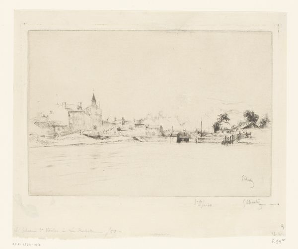 Curator: I am immediately struck by the overall mood – a sort of fragile stillness hanging in the air. Editor: We’re looking at Charles Meryon’s etching from 1860, "Passerelle du Pont-au-Change, après l'incendie de 1621." He made it after a drawing by Della Bella. You sense that fragility acutely in the architecture. The titular footbridge is just so… precarious. Curator: Precarious but functional, I imagine, patched together in response to the destruction. There’s a certain improvisational, almost slapdash quality to it that I find intriguing. You can practically smell the charred timbers. Editor: Exactly. I want to point out that this work isn’t a straightforward depiction of the event itself but a layered engagement. Meryon meticulously recreates Bella’s drawing, filtering it through his own 19th-century lens. Think about the labor involved here. Meryon is mediating another artist's representation of a disaster centuries prior. Curator: So you’re suggesting it’s not merely about documenting history, but about the layers of representation, of human responses to catastrophe as it’s remembered and recreated? There’s something about the detail in the boats on the water, the way the light hits… I keep thinking of how materials tell us about trade and how bridges are all about that, connecting economies but also always being so very vulnerable. Editor: The print itself acts like the footbridge in the picture - temporary. Meryon is always looking to the past to describe the current, and what might become the future, given time and perhaps tragedy. It is thought-provoking. Curator: It is. You've given me something to think about. Editor: Likewise. Meryon often does that.