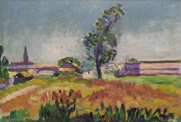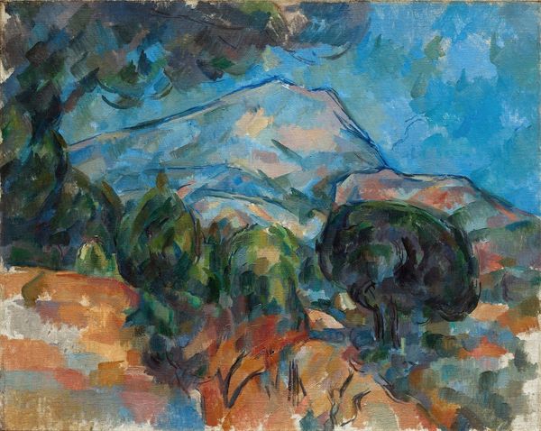 Editor: Here we have Paul Cézanne's "Mont Sainte-Victoire," painted in 1906 using oil on canvas. The painting has such a fragmented, almost blocky texture... It's quite different from what I think of when I consider landscapes. What do you see in this piece, and how do you interpret his approach? Curator: What strikes me is how Cézanne deconstructs our notions of perspective, almost politically. He refuses the traditional, singular viewpoint, opting instead for multiple perspectives coexisting on the canvas. Consider the time; traditional hierarchies in art were being challenged, reflecting broader shifts in society. Do you see how this fragmented landscape might mirror fragmented social experiences? Editor: I hadn't thought of it that way, but it does make sense. The geometric shapes remind me a bit of cubism, but also of how urban spaces are constructed, with clear boundaries and delineated zones. Curator: Exactly! Cézanne's breaking down of the landscape anticipates Cubism but also speaks to the controlled, almost regulated way we experience space, particularly landscape, through ownership and access. The mountain, seemingly an untouched natural form, is also subject to this gaze. What do you think this implies about the relationship between humans and nature in that era? Editor: It almost feels like the painting suggests we can never truly experience nature outside the context of our own constructed realities. So even his attempt at capturing nature becomes inherently artificial. Curator: Precisely. And this is what makes Cézanne such a pivotal figure; he acknowledges these inherent contradictions, inviting us to question our own perceptions and assumptions about the world around us. He makes us more critically aware of our situation, wouldn't you agree? Editor: I absolutely do! I'll never see a landscape painting the same way.