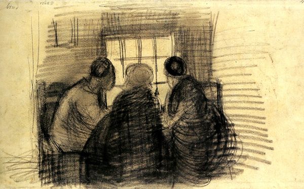 Curator: We’re now looking at "Sewing School" a drawing rendered in charcoal, attributed to Max Liebermann. Editor: It’s somber, almost oppressively so. The stark contrast of the charcoal emphasizes the dim interior, and the figures seem weighed down by their work. Curator: Indeed. Note how Liebermann uses charcoal not merely to depict, but to evoke a specific atmosphere of labor and industry. The application of the medium is critical to understanding its impact. Think about the societal demand for textiles. Editor: The composition is quite striking. All these women and girls are huddled around the tables, unified by this singular task, and by extension, their economic dependence. Notice also how the artist repeats and varies their postures. Each figure, though part of the whole, retains a unique form. Curator: Precisely. The realism underscores the laborious conditions of the subjects’ reality, the tools, and how the social structures of production confine the working class, but more so the female worker in the 19th century. The weight is palpable. Editor: Though muted, the tonal variations create a compelling visual rhythm. It makes us consider each figure individually before recognizing them as a collective. Observe the strategic deployment of light; see how it spotlights certain faces. Curator: These visual elements you are referencing must be related to the economic conditions in which such facilities function. The materiality of this artwork reminds us that those garments are brought to life, often at the cost of those bringing them into being. Editor: A powerful reminder that what seems aesthetically compelling carries profound implications. It forces us to reckon with the artist’s compositional choices and their impact on the subjects they represent. Curator: Considering the broader societal context surrounding "Sewing School" enriches our comprehension. The image speaks volumes about gendered labor and economic structures in a particular period, through the strategic application of the medium, creating a network of associations and implications beyond a single glance. Editor: Yes. Analyzing "Sewing School" through line, composition, and shading enables us to see the subjects' conditions represented on paper but also the powerful geometry in realism art.