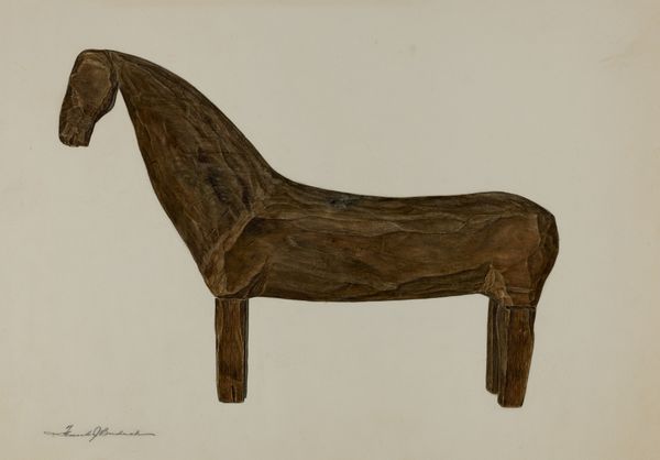 Editor: This is Charlotte Angus's "Toy Horse," created between 1935 and 1942, using colored pencil and pencil. I find its quiet, almost melancholic color palette striking. What catches your eye? Curator: Immediately, the relationship between form and material becomes apparent. The drawing meticulously replicates the smooth, carved texture one might expect of a wooden toy. Consider how the artist modulates the pencil strokes to evoke dimensionality. Observe the horse's simplified planes. Editor: The simplification does lend a somewhat modern feel. Curator: Indeed. Let us consider the composition. The centered subject, isolated against the stark background, creates a sense of stillness. The artist's engagement with shape and line lends itself to a kind of geometric formalism. Note how these basic geometric shapes come together. Would you agree that this composition amplifies the object’s austere presence? Editor: Yes, absolutely. The absence of context puts all the emphasis on the horse itself and the artistic style. I’m seeing new connections between the basic forms of the head and the body. Curator: Precisely! In examining this piece, we appreciate how formal qualities—line, color, composition— converge to produce a piece that resonates with quiet precision. Editor: I see now how focusing on those specific visual elements brings out the interesting interplay of simple shape and complex representation. Curator: And how our understanding grows from these insights.