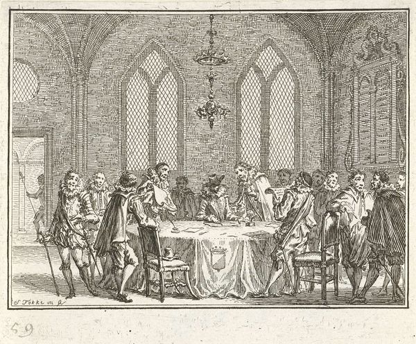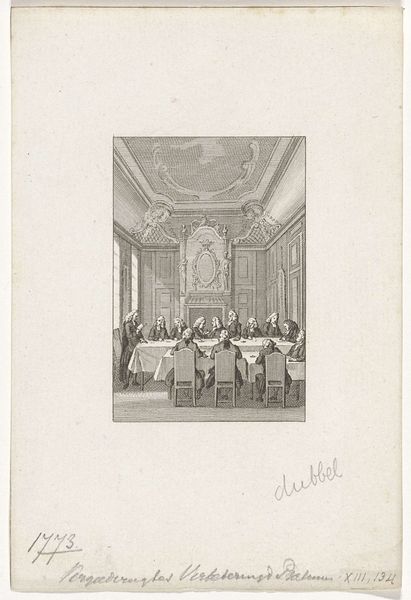 Curator: Initially, I see an exercise in monochrome restraint; shades of gray create form, light, and texture. What do you think? Editor: The composition evokes formality, yet also constraint. I want to dive into the social history depicted here. We are viewing Jacobus Buys' "Openbare voorlezing van psalmen in de vergaderzaal van de Gemachtigden in het Mauritshuis, 1 oktober 1777", or Public Reading of Psalms in the Assembly Hall of the Deputies at the Mauritshuis. It is in the collection of the Rijksmuseum. Curator: The use of ink and pen, visible in the artist's detailed lines and textures, grants it an appealing texture. This Baroque era drawing feels very rigid. Is it the subject, or the form making me feel this? Editor: It is the precise recording of this 1777 event in the Mauritshuis. Public reading of psalms had great significance within the Dutch Republic; especially at such a politically charged place. We must recall the Mauritshuis was then a public building used for governmental meetings. The act becomes almost revolutionary. Curator: The arrangement of the figures, rigidly seated around a long table, seems intentional. Notice the careful rendering of each face, capturing subtle expressions with minimalist technique. Editor: The formality of the gathering—the way these deputies present themselves and perform piety—underscores the socio-political implications embedded within the act of communal psalm reading. We might even question the function of Buys and the artwork itself: did he agree or disagree with these assemblies? Curator: Even the high, ornamented ceilings press down on the gathering; I can not help but imagine it impacts how people at the time approached and engaged with this architecture. Editor: Certainly. As Buys presents it, it shows an element of statecraft as part of the religious act. I’m particularly struck by the blend of genre and history painting here. It offers us an immediate glimpse into the complexities of late 18th-century Dutch society. Curator: It highlights not only the physical form, the geometry, and textures created by an ink pen on the page, but how material choices impact the representation itself. I walk away struck by the textures within such constraints. Editor: Precisely. We witness more than a scene; we’re offered a commentary on power, faith, and public life frozen by the artist’s perspective.