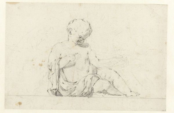 This is George Richmond's pen and ink drawing, depicting a seated man wearing a helmet. The figure's helmet immediately evokes associations with classical antiquity. It is reminiscent of the helmets worn by Roman soldiers, symbols of strength, order, and military prowess. The helmet, however, transcends its original martial context; in the Renaissance it appears in depictions of allegorical figures representing virtues or even abstract concepts. Think of how Athena, the Greek goddess of wisdom and warfare, is often portrayed wearing a helmet! The gesture of the seated man with crossed arms is seen through the ages, from depictions of melancholic philosophers to contemplative saints, each time subtly adapting in meaning yet echoing a deep, subconscious understanding of introspection. Symbols never truly disappear; they transform, resurface, and take on new life within the ever-turning cycles of history.
