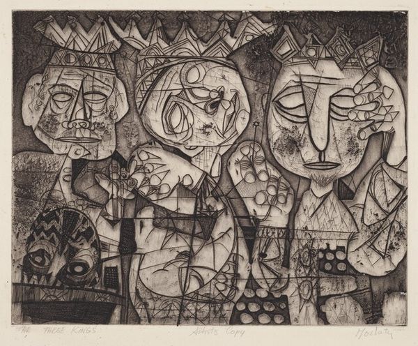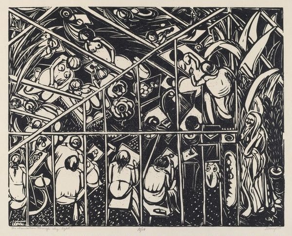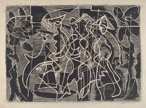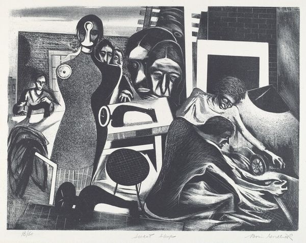 Curator: This etching by Reuben Kadish, simply titled "Untitled (Chains)," was created around 1939, a turbulent time on the world stage. Editor: It strikes me immediately as unsettling. There's a sense of confinement, not just from the figures that appear to be trapped or bound, but also from the dense layering and stark contrasts of black and white. Curator: Indeed. Kadish uses those chains not just as literal restraints, but also as powerful symbols. Think about what chains represent: oppression, enslavement, a lack of freedom – things that resonated deeply during the rise of totalitarian regimes in the pre-war years. The recurring figures are also telling – those spectral bodies seem trapped between dimensions of existence. Editor: Looking at the work through the lens of materiality, the graphic quality is achieved via laborious process of etching. The way the plate bites create these contrasting textures is significant – almost as if the materiality reinforces the violent imagery and dark psychology present here. There's a weight, a literal pressing-down felt throughout. And how was that labor organized? Curator: That’s interesting, isn’t it? The dense line work, the heavy shading... these build to an atmosphere of dread. But the images themselves contain older, more universal references too – figures reminiscent of those in mythological art, and a suggestion that such power can also be internal, self-imposed. There's a complex interplay between individual and collective experience, of both psychological states and real political contexts. Editor: Perhaps that duality explains its enduring resonance. The tension between freedom and control plays out across many social registers even today. It seems a very intentional aesthetic and political project made concrete through its production, too. The chain imagery becomes that of process in tandem to the aesthetic project here – something that can and is physically worked. Curator: Agreed. Its lasting impact, for me, resides in the powerful distillation of a period rife with global uncertainty, fear, and hope. Editor: For me, it brings me back to the production of such pieces during fraught political moments - how and by whom that material translation took place is what makes this artwork continue to stay with me.