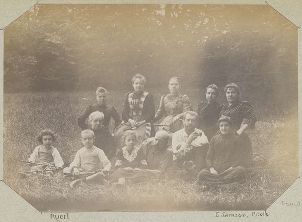 Editor: This photograph, taken on August 21st, 1869, by Iorwerth Grey Lloyd, captures a group on the grounds of Kennington Vicarage. It feels like a window into a very specific moment in time. What details stand out to you? Curator: The meticulous arrangement speaks volumes. Notice the hierarchy implied in the seating and standing positions. The clergy are prominent, suggesting their societal importance, but also consider the table as an altar. What kind of communal memory are they intending to create? Editor: I hadn't considered the arrangement as symbolic, but now I see it. Thanks! Curator: Yes, and the formal attire, the setting—they all contribute to a carefully constructed image meant to convey a certain message about their identity and status.