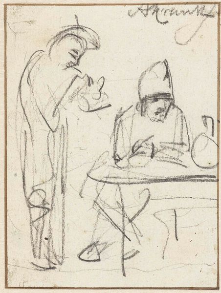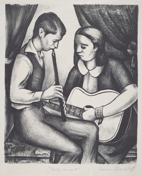Mikuláš Galanda made this watercolor and ink drawing, Lovers Harlequin and Columbine, using simple materials. Galanda's application of watercolor gives the painting its distinctive appearance. The colors are muted, and there’s a subtle blending of tones across the figures and background. The ink outlines give the forms definition but also create a sense of flatness. There are very visible individual marks from the artist’s hand. The visible labor in the production process reflects Galanda's commitment to the values of craft. He embraced an aesthetic that valued simplicity and honesty of construction. This approach was a deliberate choice, setting his work apart from more academic styles that were the norm in his time. Galanda elevated the act of making to be as important as the subject matter, challenging distinctions between art and craft.
