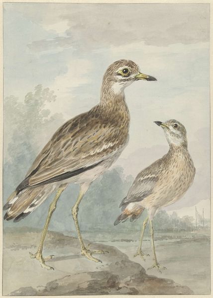 Aert Schouman created this watercolor drawing titled "Drie vogels, twee Incaduiven en een gekraagde baardkoekoek" at an unknown date. The work presents three birds arranged against a sky. Their placement creates a gentle, upward-moving diagonal across the composition. The drawing employs delicate washes of color, with soft blues and browns dominating the palette. The texture of the birds' feathers is subtly rendered, adding a tactile dimension to the work. This attention to detail invites the viewer into a space of close observation. Schouman’s precise rendering of each bird serves not only as a depiction but also as an exploration of form and structure within the natural world. The background is lightly indicated, ensuring that the birds remain the primary focus. Yet, the overall effect is one of careful balance between scientific observation and aesthetic presentation. This drawing offers an opportunity to think about the formal qualities of representation and the ways in which artists engage with the natural world through the visual language of art.