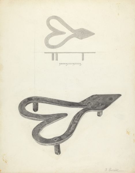 Curator: Looking at this artwork from around 1936, "Coffee Grinder," a pencil drawing by Herman Bader, what strikes you? Editor: Well, it’s such a serious, almost reverential depiction of something so mundane. It feels like a meditation on the ritual of making coffee, you know? Like a high priestess conducting a caffeine ceremony. Curator: The geometric structure and attention to tonal gradations is particularly compelling here. Bader presents an analytical exploration of form through meticulous cross-hatching. Editor: Meticulous is right. There's something very austere and...I don't know...lonely about it? The way the pencil captures the light and shadow, it's almost melancholy. Like a machine missing its human counterpart. Curator: Interesting interpretation. One could argue Bader is capturing the intersection of modern design principles with the domestic sphere. The additional schematic sketches above reinforce that sense of design process, perhaps for mass manufacture. Editor: I see it slightly differently, even with those schematics. It evokes a quiet, still life, almost Morandi-esque. The textures feel soft and inviting despite the geometry. It’s functional, of course, but Bader highlights an understated beauty, doesn't he? Curator: The composition and sharp perspectival shift certainly contribute to the modernist aesthetic he appears to be channeling. Bader masterfully transforms an everyday object into a compelling visual study. Editor: Yes, well said. It gives one cause to ponder about what "art" actually means if a coffee grinder gets this much love. Curator: I believe we've scratched the surface of that question quite nicely ourselves. Editor: Indeed, a caffeine-fueled question perhaps best mulled over slowly.