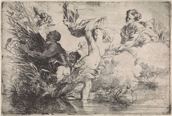 Curator: Look at this dynamic etching, Proserpine, created around the 17th century by Stefano della Bella. The medium here is print. Editor: Immediately, I sense a feeling of drama and intensity, perhaps even violence, in this baroque artwork. There’s a raw energy in the way the artist has captured the movement of the figures. Curator: Absolutely, we see Pluto abducting Proserpine, a crucial scene from Roman mythology dealing with power dynamics, and, I dare say, a commentary on the lack of bodily autonomy afforded to women. The story is an integral part of the Western narrative. Editor: It is a very interesting take indeed, a lot can be seen through it. In terms of its enduring imagery, this scene and its visual depiction are very charged with potent symbols: The forceful capture, the chariot drawn by rearing horses, which appear demonic, seem like visual shorthand for dominance, while Proserpine symbolizes the beauty and vulnerability of Spring being dragged to the Underworld. It’s interesting that she is completely embraced in a dominating pose. Curator: Contextually, it is important to remember that artists then were deeply implicated in larger structures of patriarchal power. How many representations do we have of female subjugation disguised as classical scenes or harmless fantasies? I always have trouble distancing this awareness from my experience of viewing such an artwork. It reflects anxieties related to gendered identity. Editor: But the artist uses symbolism to explore deep aspects of human behavior; art, therefore, becomes a vessel to contain all of that. Isn't there also beauty in understanding these cultural roots and the human patterns of understanding the world around them? In the end, aren't we, like Proserpine, subjects to something beyond our control, if only time and fate? Curator: Perhaps. And maybe our interpretations change depending on the historical moment. I guess what strikes me is that maybe by talking about these narratives in their own context we open a new dialogue, an awareness. We give viewers today the critical tools to form their own understanding of an old piece. Editor: Exactly. Perhaps this image functions, paradoxically, as a visual portal, carrying collective, cross-generational human dreams. A perfect point to reflect further about a very ancient matter that we made new again with this brief reflection.