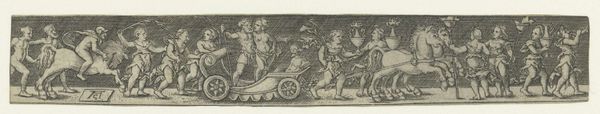Sebald Beham created this tiny, intricate print of ‘Fries met een triomfwagen waarin de jonge Bacchus zit’ without a known date. This artwork presents a parade of cherubic figures surrounding the young god Bacchus in his chariot. Made in 16th century Germany, this print reveals the cultural fascination with classical mythology during the Renaissance. Bacchus, the god of wine, fertility, and theatre, was a popular figure, symbolizing abundance and celebration. The procession itself, rendered in miniature, is a visual reference to ancient Roman triumphs, which were public displays of military victory. The work would have been made for a wealthy patron, demonstrating the visual culture of the elite classes. As historians, understanding this print involves examining the social function of art in Beham's time, considering how it reflects both the revival of classical themes and the social hierarchies of the period. We might consider sources such as contemporary texts on mythology, social histories of the period, and studies of artistic patronage.