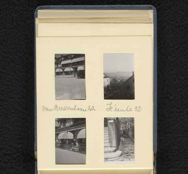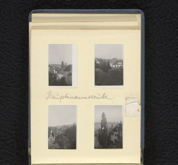 This is a page from a photo album made by the Wachenheimer family in Karlsbad, May-June 1937. It's a little grid of small black and white snapshots, neatly arranged on a cream-colored page. The marks here are not brushstrokes but the crisp edges of the photographs, each one a captured moment. The texture comes from the contrast of the matte paper and the glossy photos, creating a subtle dance of light. Look at the way the photos are arranged, almost like a storyboard, each image offering a different view of the town. It's not just about seeing; it’s about how we piece together fragments to form a whole. Notice how the family have written the location and the date underneath the images, a simple act of archiving, but that tells a story of travel and memory. It makes me think of Gerhard Richter’s "Atlas," where he collected and arranged photos, exploring the relationship between personal and collective memory. Art is always in conversation, and even a family photo album can speak volumes about time, place, and the human experience.