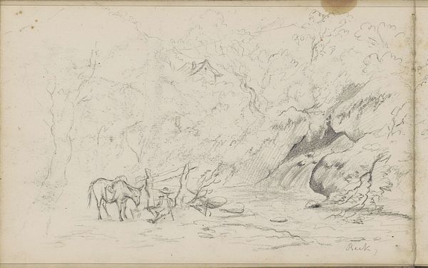 Editor: This is Willem Cornelis Rip's "Waterval op het landgoed Oorsprong te Oosterbeek," a pencil drawing from 1874. It feels almost like a quick note, capturing a fleeting moment. I'm curious, what social or historical narratives might be woven into this seemingly simple landscape? Curator: A crucial question! We often see landscapes as passive backdrops, but they’re always loaded with meaning. Consider this: Rip painted this during a time of increasing industrialization and urbanization in the Netherlands. How might this drawing be interpreted as a response to those changes, perhaps even as a subtle form of resistance or longing for a disappearing rural idyll? Editor: That's fascinating. So the choice of subject, even something as "natural" as a waterfall, becomes a political statement? Curator: Precisely. Think about who had access to these landscapes, too. Leisure time and the ability to travel and sketch were often privileges linked to class. Is there an implicit narrative of exclusion present, a visual statement about who belongs in this landscape? Editor: So, beyond just being a pretty picture, it could be read as a commentary on social inequalities? That really changes how I see it. I’m used to thinking about portraiture or history paintings holding those kinds of messages. Curator: Landscapes are never neutral. They're always shaped by power, ideology, and the artist's own position within society. Considering that Rip painted this particular location in Oosterbeek, were there particular social issues or communities linked to it? Editor: I'll definitely look into the history of Oosterbeek! This makes me think about how much art history I have to learn beyond the art itself. Curator: It's an ongoing process of peeling back the layers, questioning assumptions, and seeking out marginalized voices and perspectives. The real beauty is in connecting the art to these broader stories.