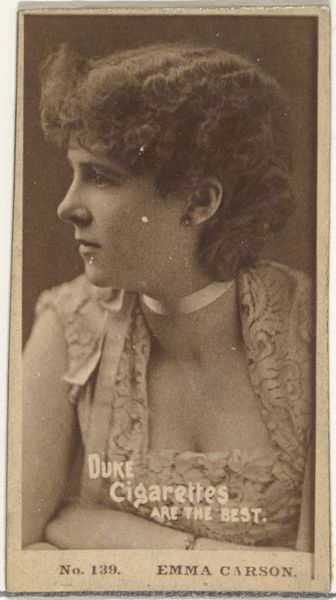 Curator: This albumen print is part of a series of actress portraits produced around 1890 by Kinney Brothers to promote their Sweet Caporal Cigarettes. The piece is titled "Mrs. Lydia Yeamans Titus" and, while now in the collection of the Metropolitan Museum of Art, it was originally a trading card. Editor: My first thought is how fragile and ephemeral it appears. The soft, sepia tones evoke a sense of delicate history, like a cherished memento tucked away in a worn album. And it was created for a tobacco company? Interesting contradiction! Curator: Exactly! These cards became highly collectible, creating an intersection between popular culture, advertising, and the theater. These portrait cards, while promoting commodified items such as tobacco, functioned as social currency, shaping perceptions of fame. Lydia Yeamans Titus was a star and celebrity. Editor: The printing process, using albumen derived from egg whites to bind the photographic chemicals, speaks volumes about labor-intensive early photography. We often divorce photographic images from discussions of craftsmanship. Each one represents a huge investment of time and materials. It's hard to imagine so much care invested in marketing. Curator: That’s a crucial point. The use of celebrity images also highlights the changing landscape of fame and its ties to commercial endorsements. Lydia Titus was known for performing in drag and blackface, now extremely offensive and problematic but also representative of the entertainment culture of the late 19th century. Editor: That brings a complexity to the piece. This innocent portrait served to promote harmful stereotypes and power dynamics. And thinking about those tiny cards changing hands, being traded… Curator: It emphasizes how deeply these performances were embedded in society. The seemingly innocuous act of collecting these cards becomes a participation in the popularization, or normalization, of racial caricature. It shows the public role of images. Editor: Absolutely. Analyzing the materiality and social context of this photograph exposes the underlying issues of labor, celebrity, and troubling representations woven into its creation and distribution. It invites critical examination of material culture and popular beliefs. Curator: By exploring it, we can reflect on the complicated legacies of image-making and their profound influence.
