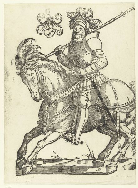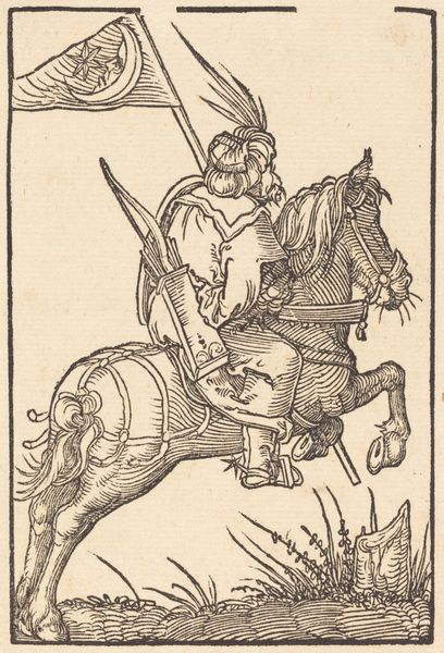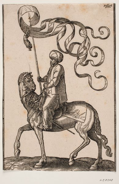 Melchior Lorck created this image of a mounted standard-bearer using etching techniques. The linear precision and stark contrast immediately draw the eye, framing the rider and his steed in a profile view against the plain backdrop. The visual elements of line, form, and texture create a sense of depth and movement. Lorck masterfully uses hatching and cross-hatching to model the forms of the horse and rider, giving them weight and presence. Notice the standard-bearer’s flag: its elaborate design and the way it unfurls in the wind, gives a dynamic quality to the otherwise stoic composition. This can be interpreted through the semiotic lens as a signifier of power, loyalty and perhaps, the complexities of 16th-century military and social structures. The texture, achieved through meticulous etching, adds a tactile dimension to the print, inviting the viewer to consider the materiality of both the artwork and the depicted subject. The visual structure challenges fixed meanings, offering instead a layered narrative about duty, status, and the artistic techniques used to convey these ideas.